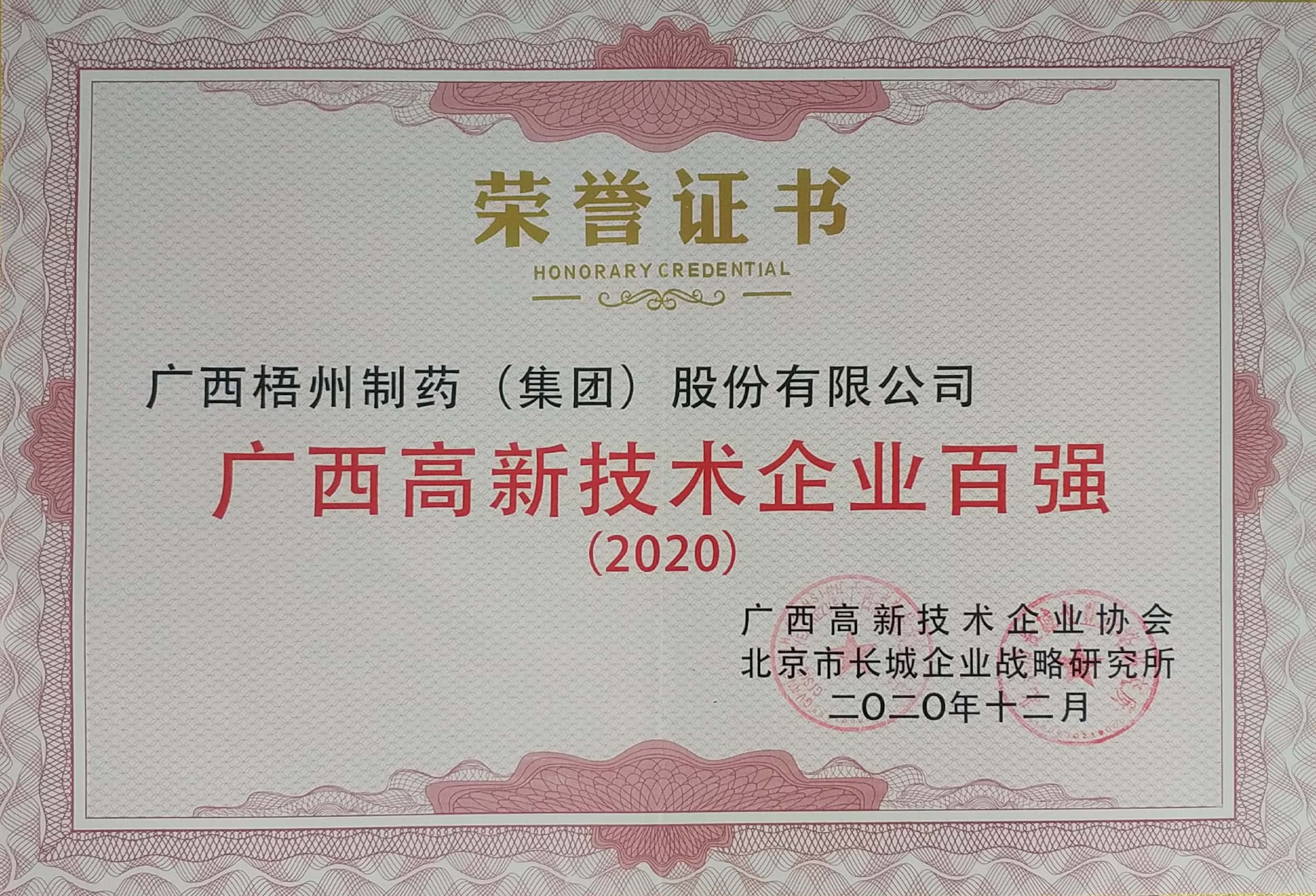 荣获2020年广西高新技术企业百强称号