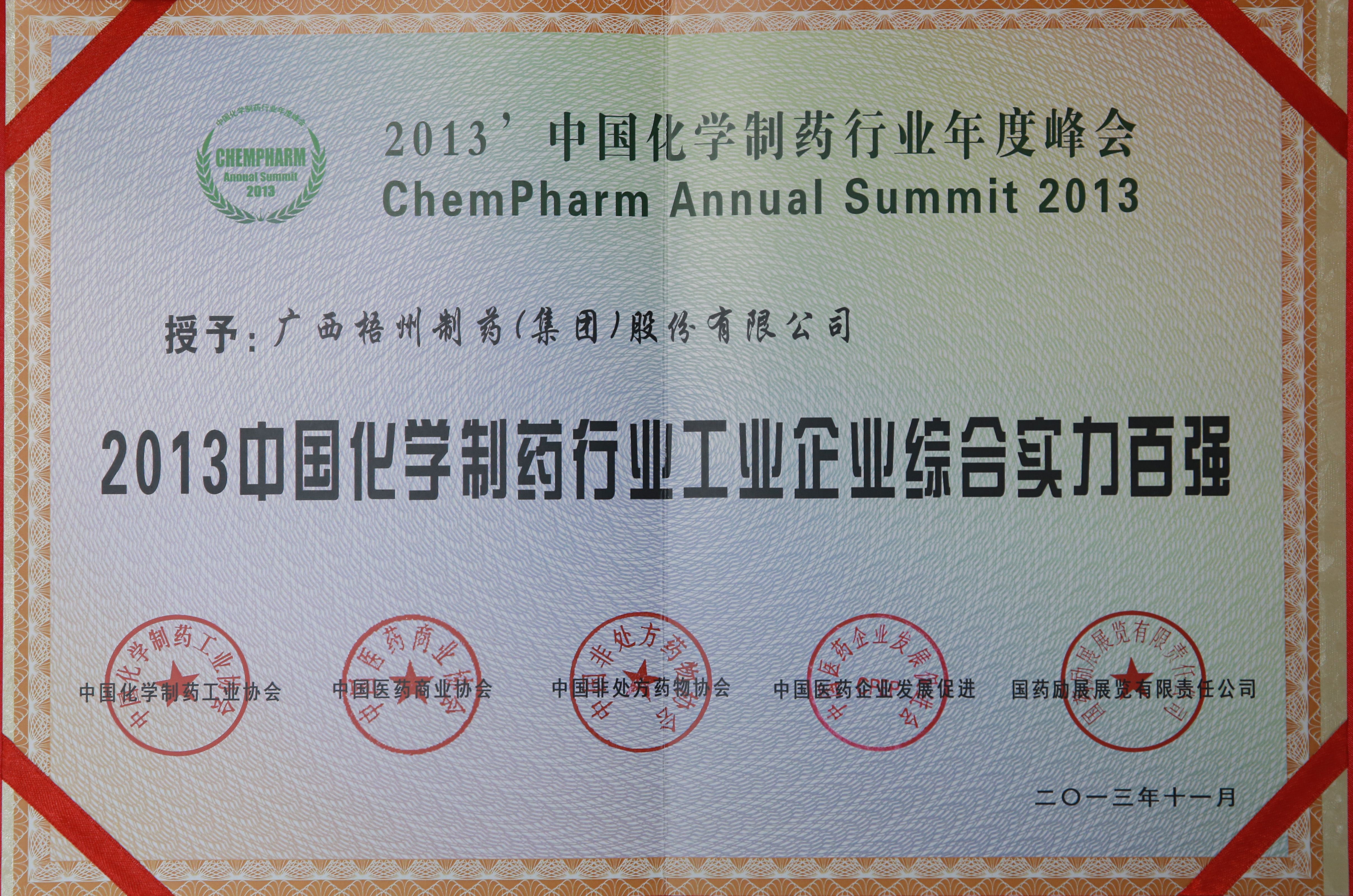 2013年度评选为中国化学制药行业工业企业综合实力百强