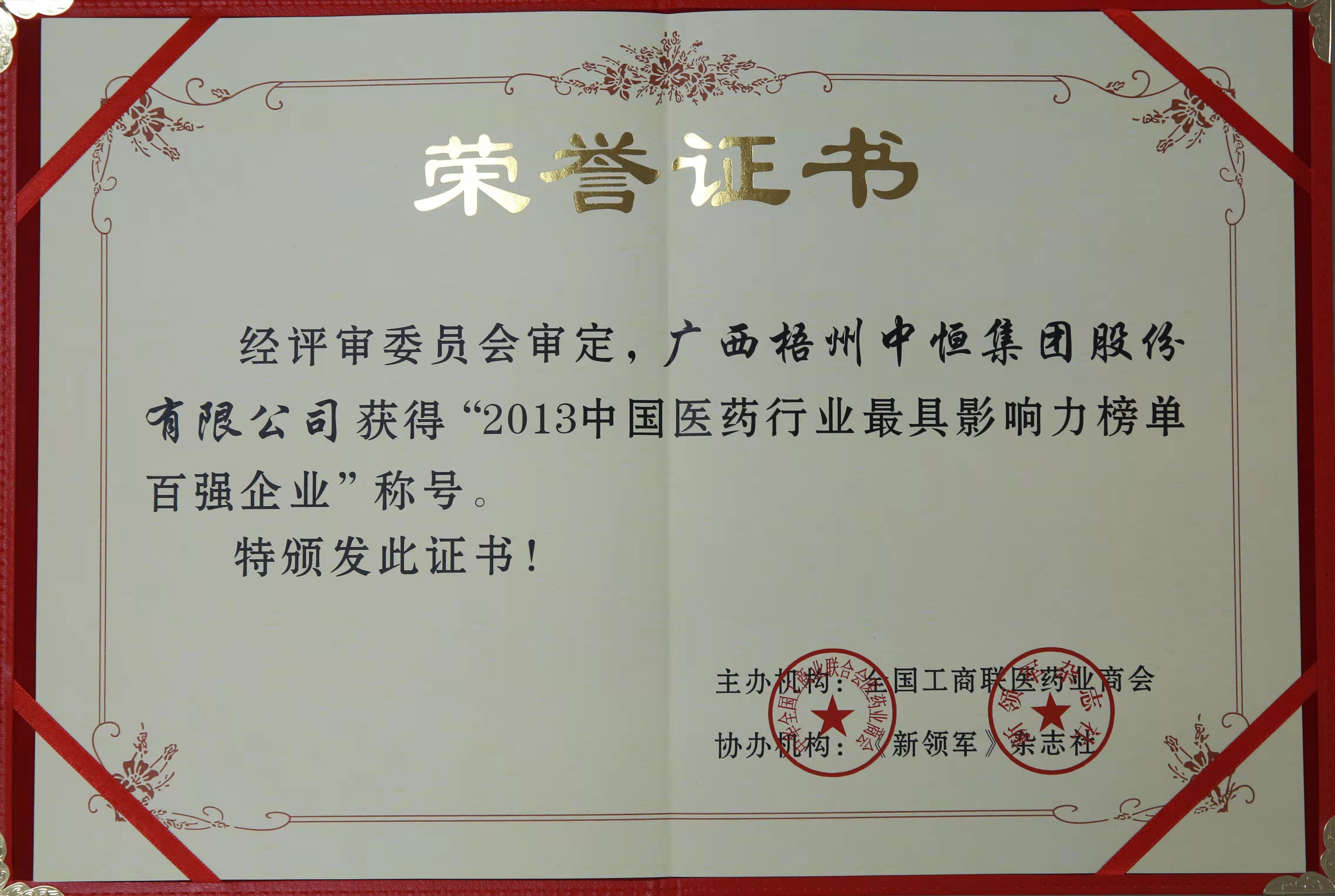 荣获“2013年中国医药行业最具影响力百强企业”称号