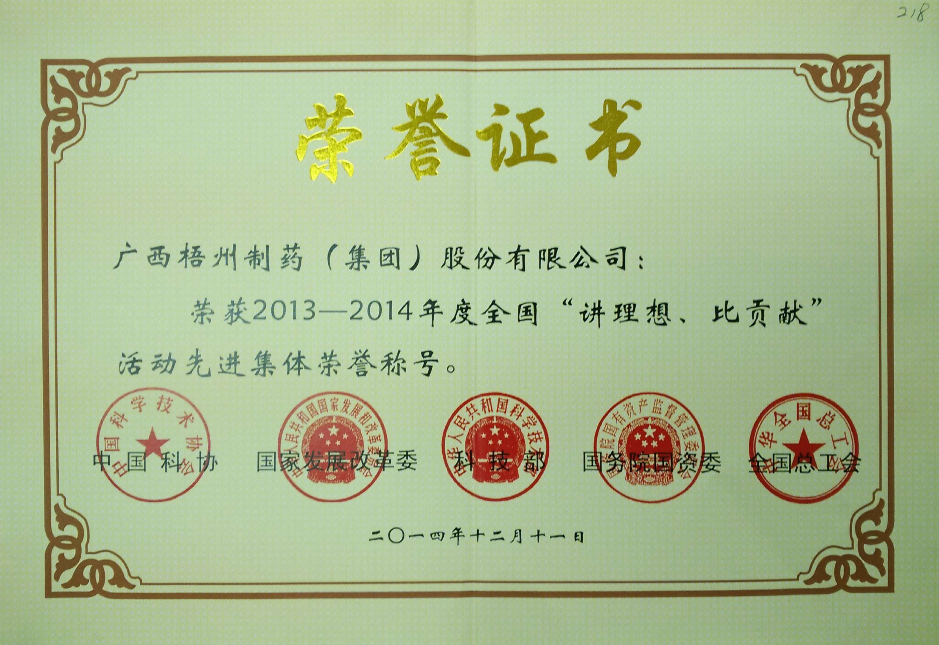 荣获2013-2014年度全国“讲理想,比贡献”活动先进集体荣誉称号