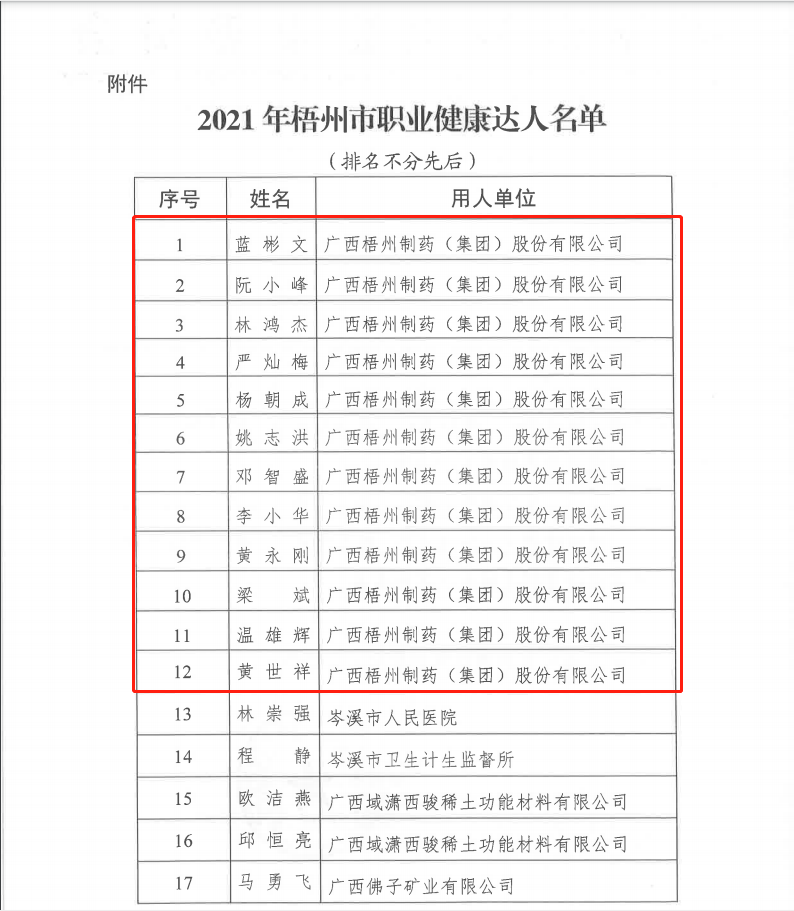 近日,梧州市卫生健康委公布2021年度梧州市职业健康达人评选结果,betway必威12名职工获得“职业健康达人”称号。