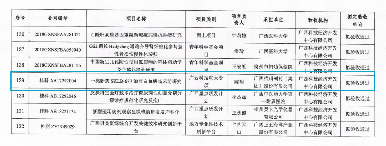 根据广西科技项目评估中心发布的“广西科技计划项目拟定验收结论公示”(公示期:2022年7月22日—28日),中恒集团betway必威承担的广西科技重大专项《一类新药SKLB677治疗白血病的临床前研究》项目通过验收。