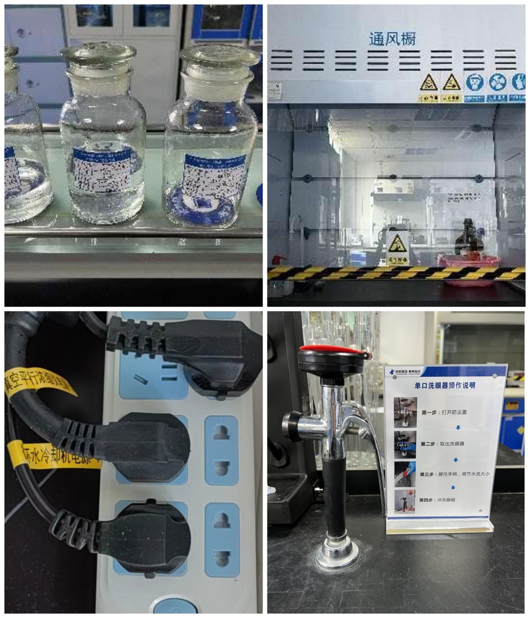 安全是企业的生命。实验室内存放的试剂、各种检验操作均存在一定的风险,做好安全警示,既是保证安全检验,也是人员健康的一大保障。将试剂按酸(红)、碱(黄)、普通(蓝)、有毒(黑)分类标识,标识后试剂属性及风险清晰明了。在通风橱增加黄黑警示线及安全警示标示等,提醒人员做好安全防护。梳理管道、电源线走向与标识,在紧急状态下能快且准地拔插头断电。应急处理的洗眼器旁放置操作方法标示,便于紧急状况下的准确操作。这一系列举措极大提高了检验工作的安全性。