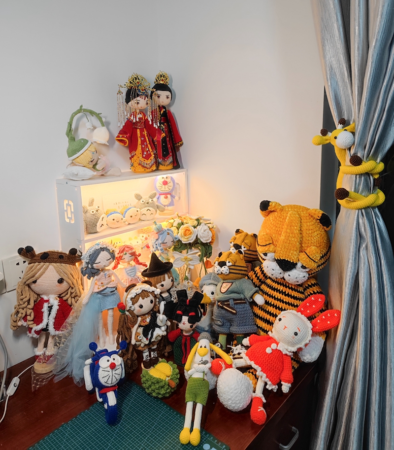 待在家里用毛线钩织各种物件和玩偶