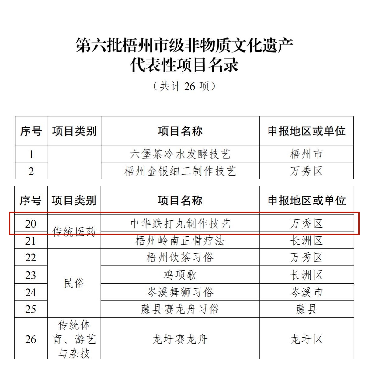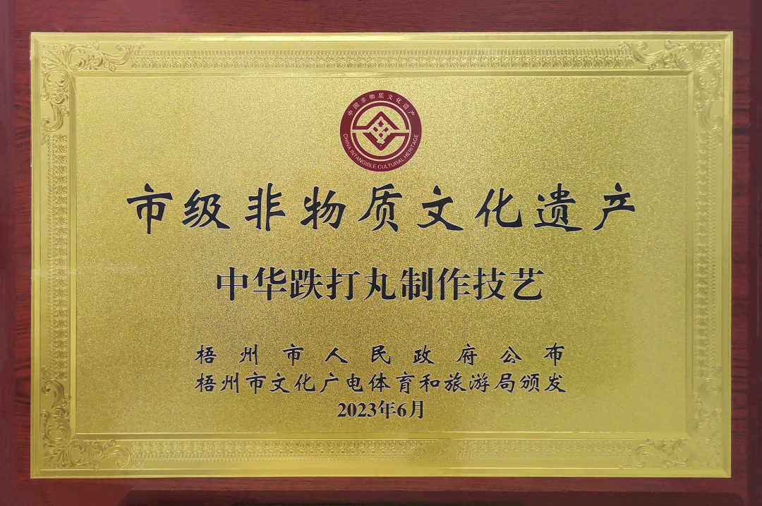 近日,在梧州市文化广电体育和旅游局主办的2023年“文化和自然遗产日”梧州市主会场宣传展示活动中,betway必威中华跌打丸制作技艺获授牌匾,成功入选梧州市第六批非物质文化遗产代表性项目名录。