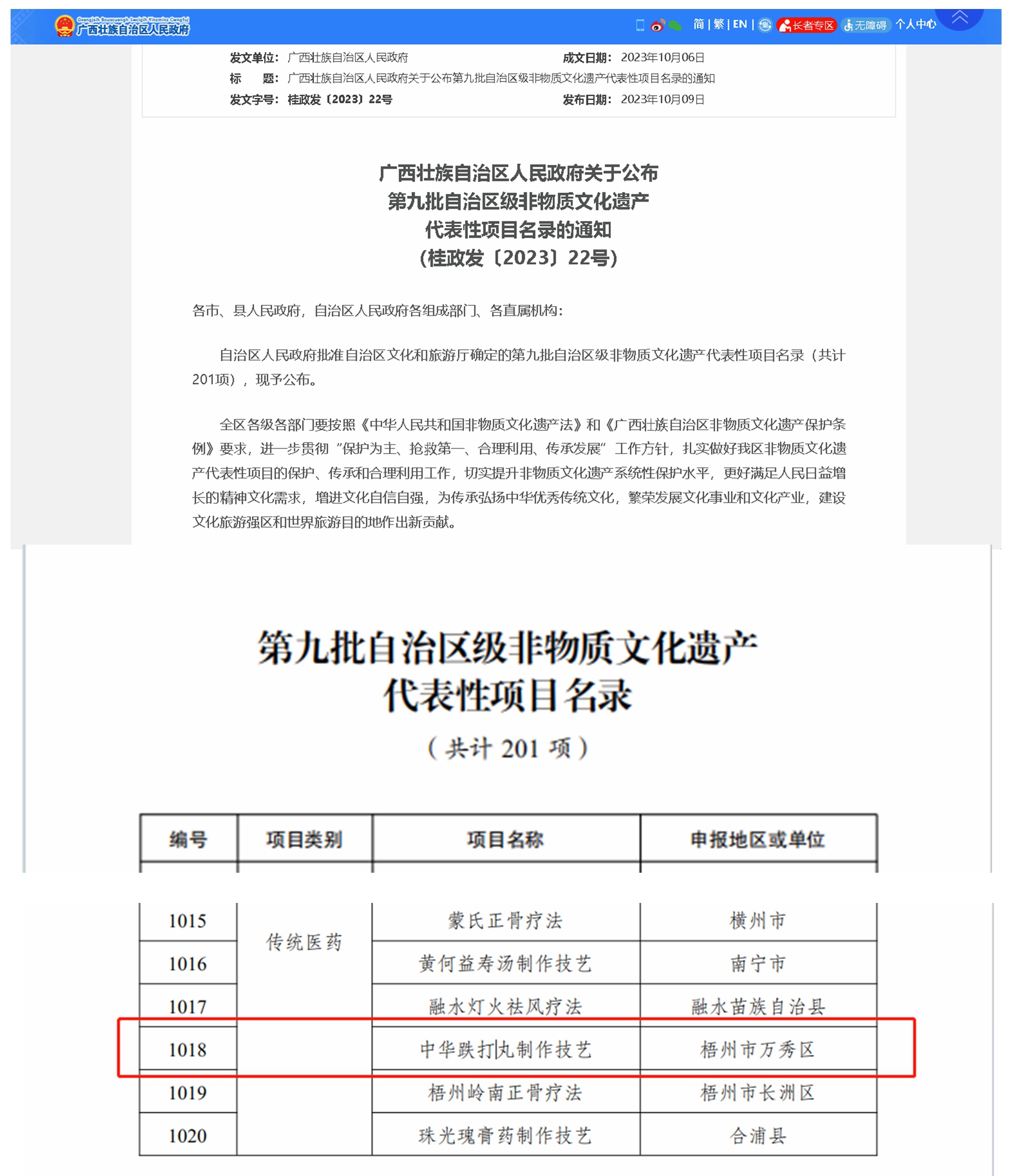 近日,广西壮族自治区人民政府公布了第九批自治区级非物质文化遗产代表性项目名录,betway必威申报的中华跌打丸制作技艺成功入选,榜上有名。