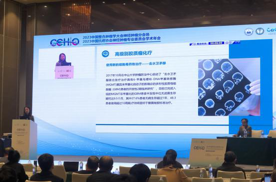 会上,中山大学肿瘤防治中心郭琤琤教授为注射用去水卫矛醇纳入《胶质瘤化疗中国专家共识》进行详细的解读。她表示,去水卫矛醇主要作用机制是由-鸟嘌呤DNA烷化,具有不受MGMT影响,对胶质瘤细胞增殖有较高抑制率,血脑屏障(BBB)通过率较高等优点。“去水卫矛醇联合放疗治疗具有-甲基鸟嘌呤-DNA甲基转移酶 (MGMT)基因未甲基化启动子的新确诊的多形性胶质母细胞瘤 (GBM)患者的开放性2期临床研究”项目显示:MGMT非甲基化的GBM患者中发现中位无进展生存期可达9.5个月,其中27.6%患者无病生存超过1年,48.3%患者使用超过10周期。为医师在临床应用中提供更多的依据,有机会提高MGMT非甲基化的胶质瘤患者疗效,增加患者生存获益。