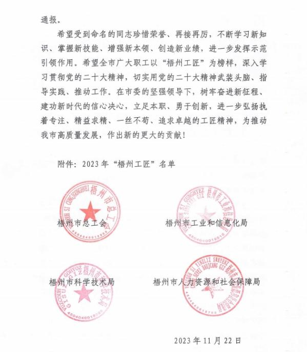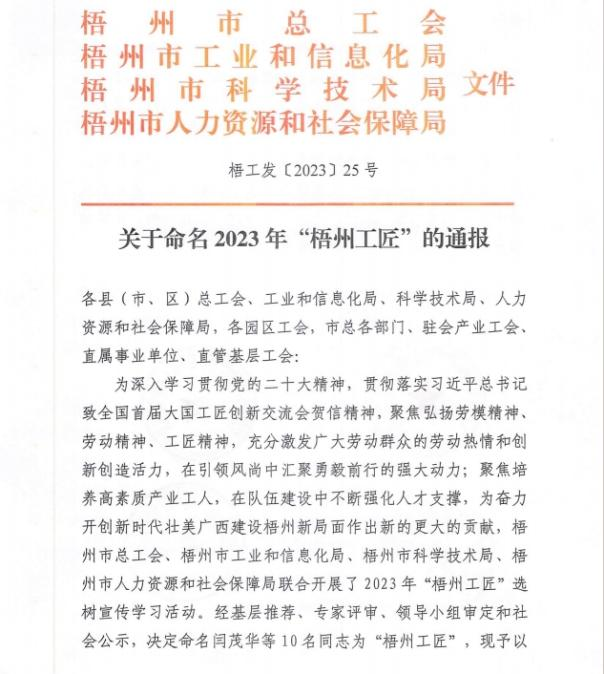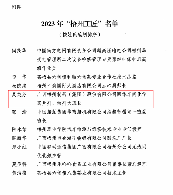 近日,梧州市总工会、梧州市工业和信息化局、梧州市科学技术局、梧州市人力资源和社会保障局联合发布《关于命名2023年“梧州工匠”的通报》,梧州市有10名同志被选树为“梧州工匠”,其中,betway必威固体车间化吴纯芬获此殊荣。