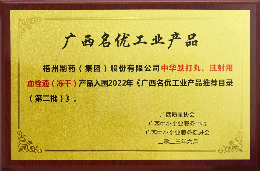 中华跌打丸、注射用血栓通(冻干)产品入围2022年《广西名优工业产品推荐目录(第二批)》