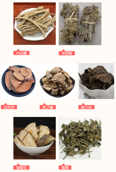 臣药:牛白藤、羊耳菊、过岗龙、丢了棒、假蒟、穿破石、制川乌