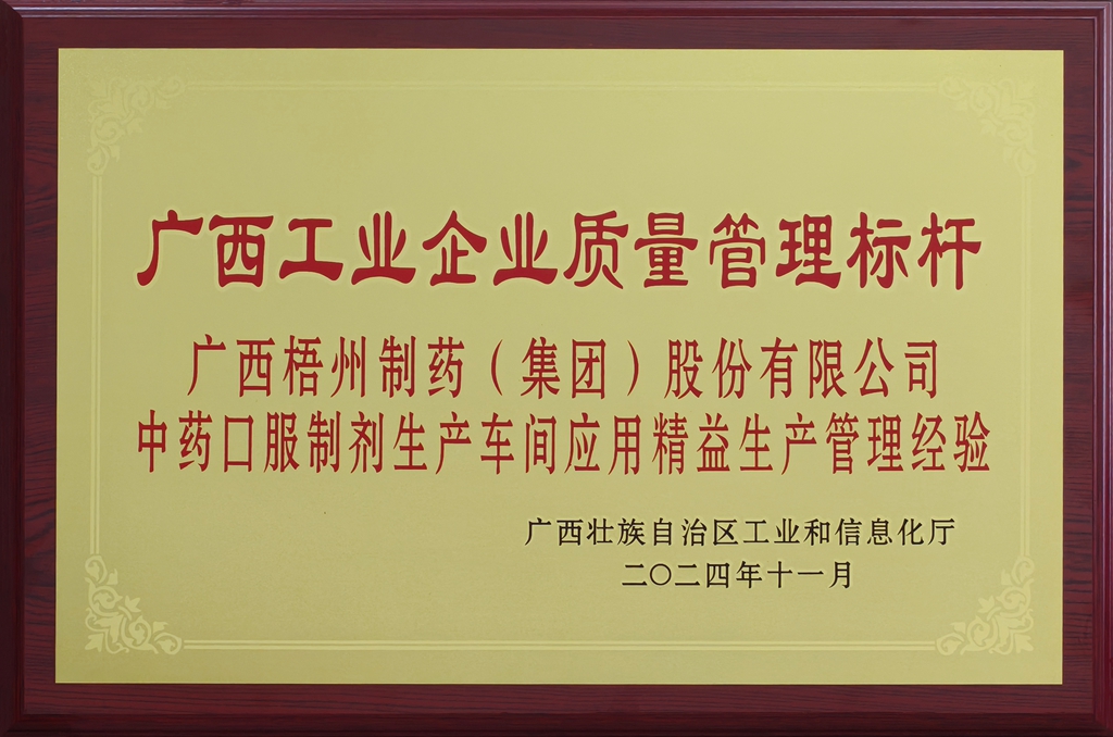 betway必威(中药口服制剂生产车间应用精益生产管理经验)荣获广西工业企业质量管理标杆