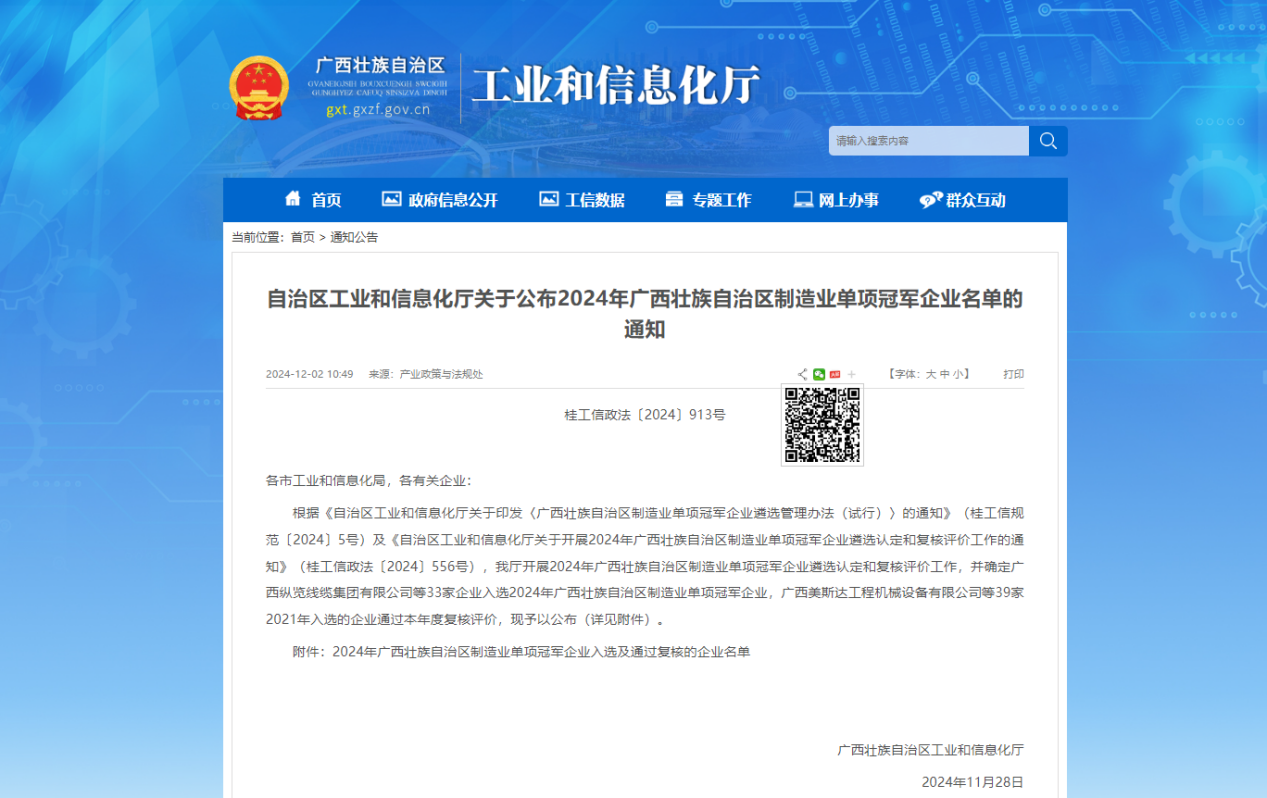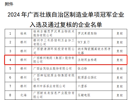 近日,广西壮族自治区工业和信息化厅公布2024年广西壮族自治区制造业单项冠军企业名单,betway必威凭借着冠军产品注射用血栓通卓越的技术能力和市场竞争力,顺利通过了每三年一次的复核评价。