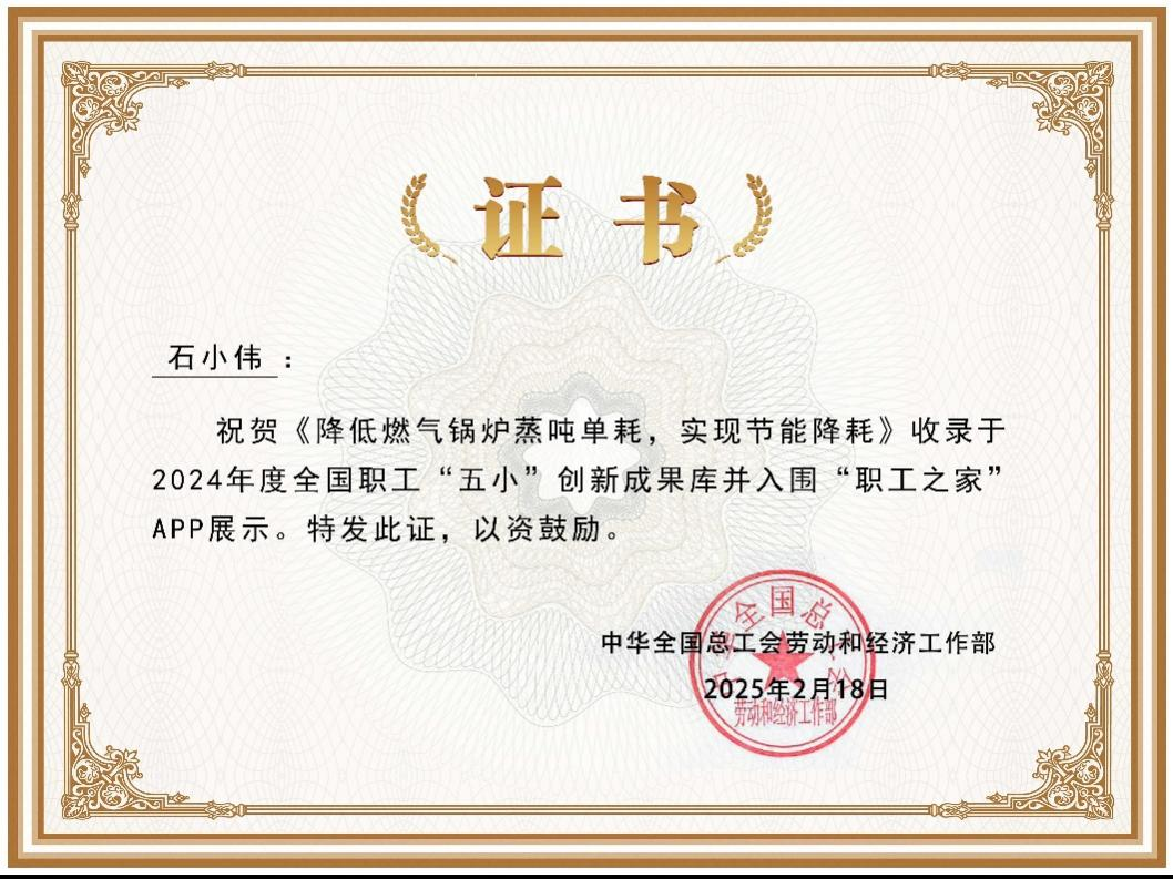 近日,全国总工会公布2024年度全国职工“五小”创新成果库录入名单。betway必威动力基建车间凭借一招“省气绝活”—— “降低燃气锅炉蒸吨单耗,实现节能降耗”,从全国3.4万个参赛项目中脱颖而出,成功入选全国职工“五小”创新成果库。这不仅是betway必威的“高光时刻”,更在全国总工会的“职工之家”APP上展示亮相,妥妥地秀了一把betway必威工人的创新实力。