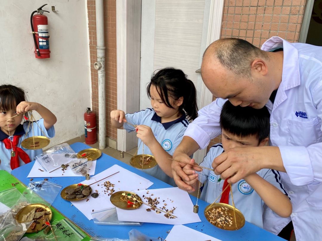 “原来中药这么有趣!”在中药辨识区,孩子们围着展台兴奋不已,通过触摸、嗅闻药材,辨识药材的质地与气味,互动式的教学方式让传统中药知识变得生动有趣。“老师,这个铜秤好精致!”戥秤体验台前更是热闹非凡,一杆杆古朴的戥秤吸引了孩子们的目光,专业药师正手把手地教孩子们“一钱一两”的精准称量,孩子们全神贯注地操作,感受着中医药文化的严谨与精妙。